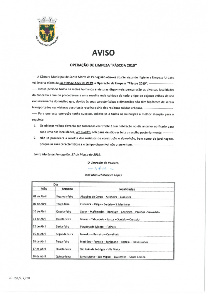 De 8 a 18 de abril, a Câmara Municipal de Santa Marta de Penaguião, através dos Serviços de Higiene e Limpeza Urbana, vai colocar em ação a Operação de Limpeza Páscoa 2019.