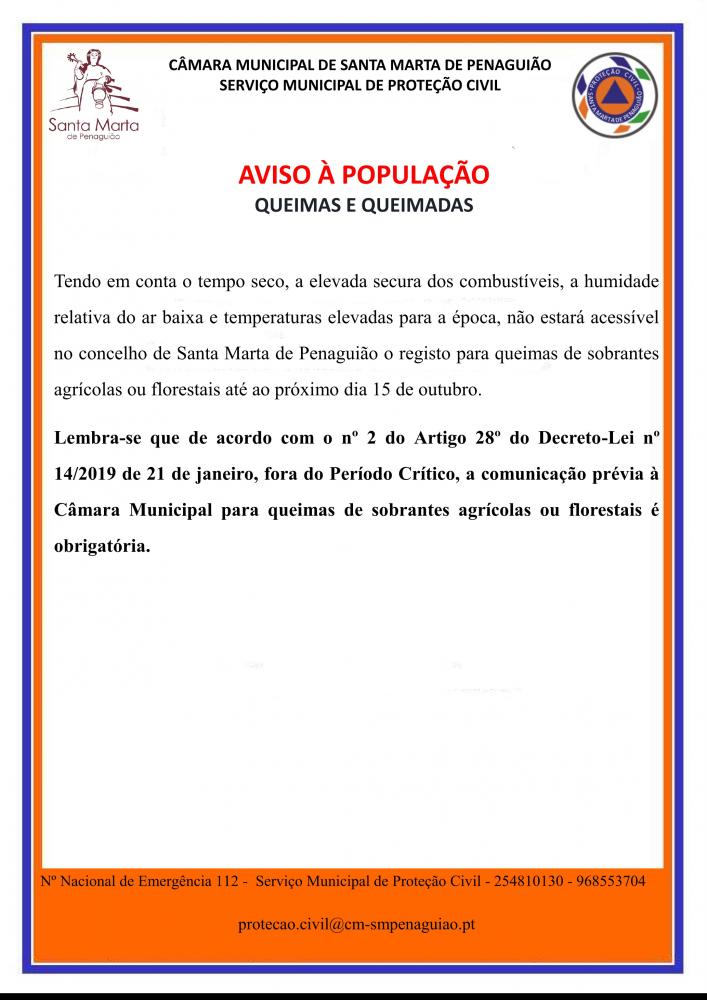 Tendo em conta o tempo seco, a elevada secura dos combustíveis, a humidade relativa do ar baixa e temperaturas elevadas para a época, não estará acessível no concelho de Santa Marta de Penaguião, o registo para queimas de sobrantes agrícolas ou florestais até ao próximo dia 15 de outubro.