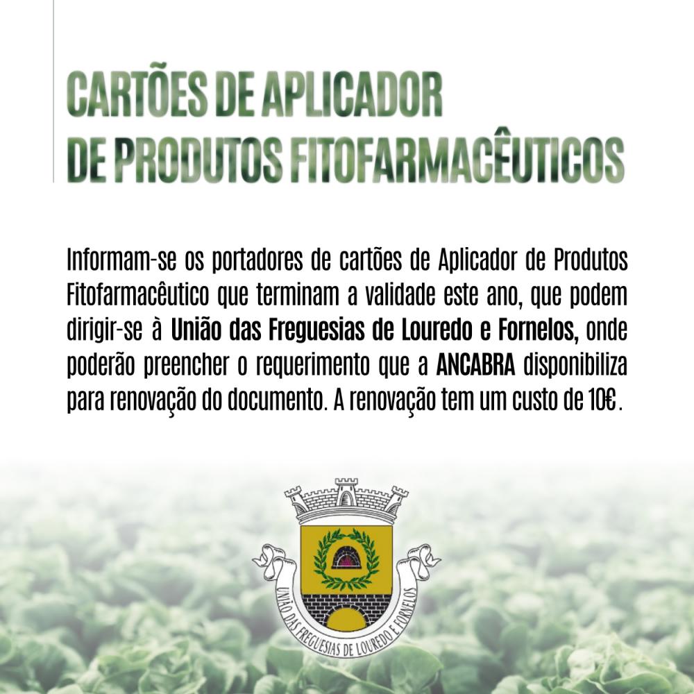 Informam-se os portadores de cartões de Aplicador de Produtos Fitofarmacêutico que terminam a validade este ano, que podem dirigir-se à União das Freguesias de Louredo e Fornelos, onde poderão preencher o requerimento que a ANCABRA disponibiliza para renovação do documento. A renovação tem um custo de 10€.