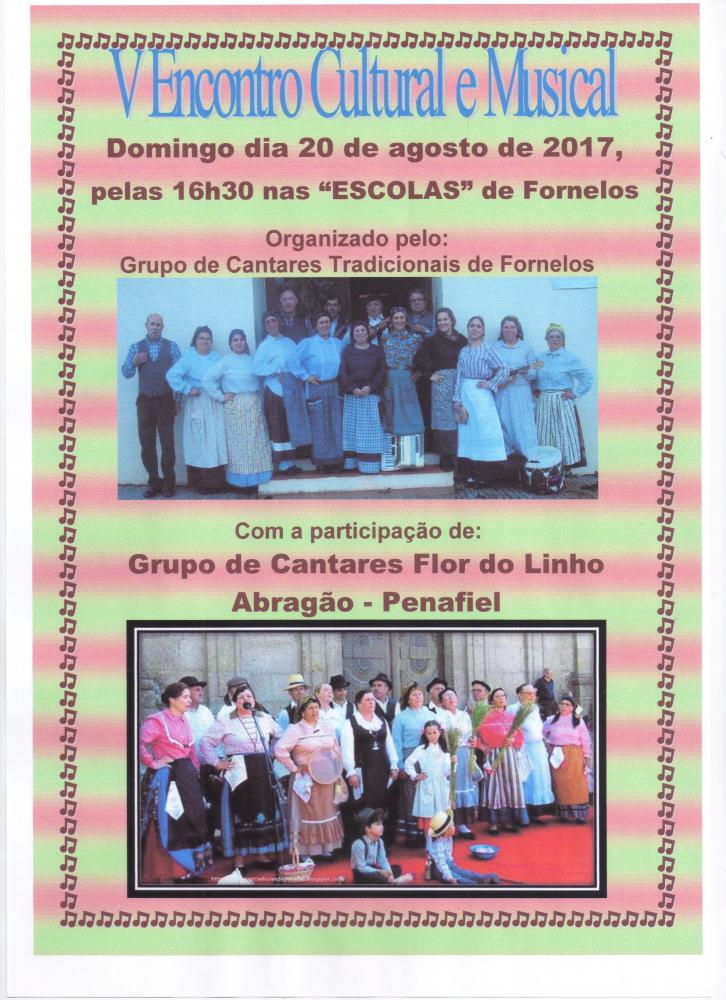 O Grupo de Cantares Tradicionais de Fornelos, tem o prazer de convidar todos os sócios, amigos e conhecidos a estarem presentes no seu V Encontro Cultural dia 20 de agosto do corrente ano, pelas 16.30 h, junto à atual sede de União de Freguesias e antigas escolas primárias de Fornelos.